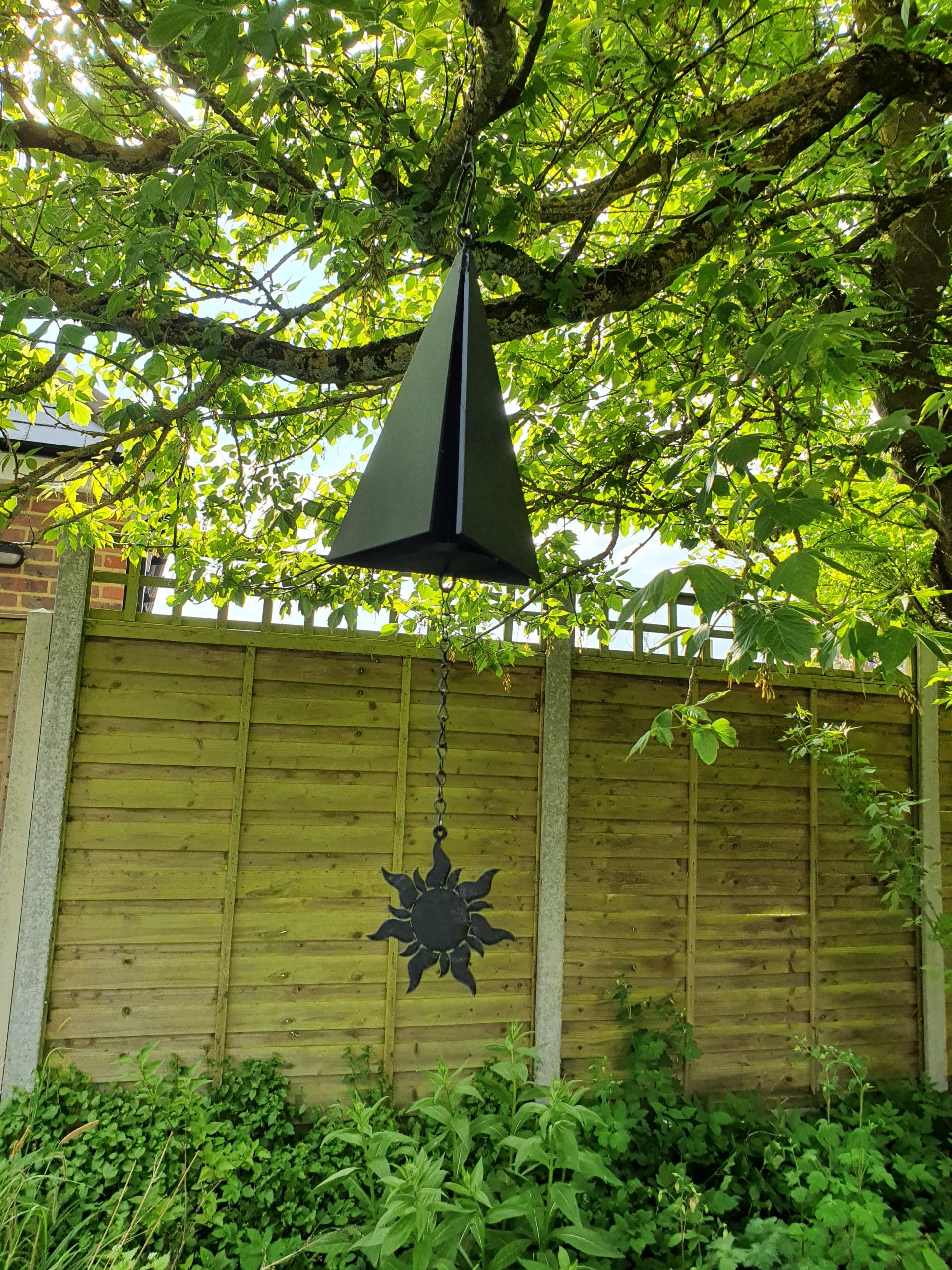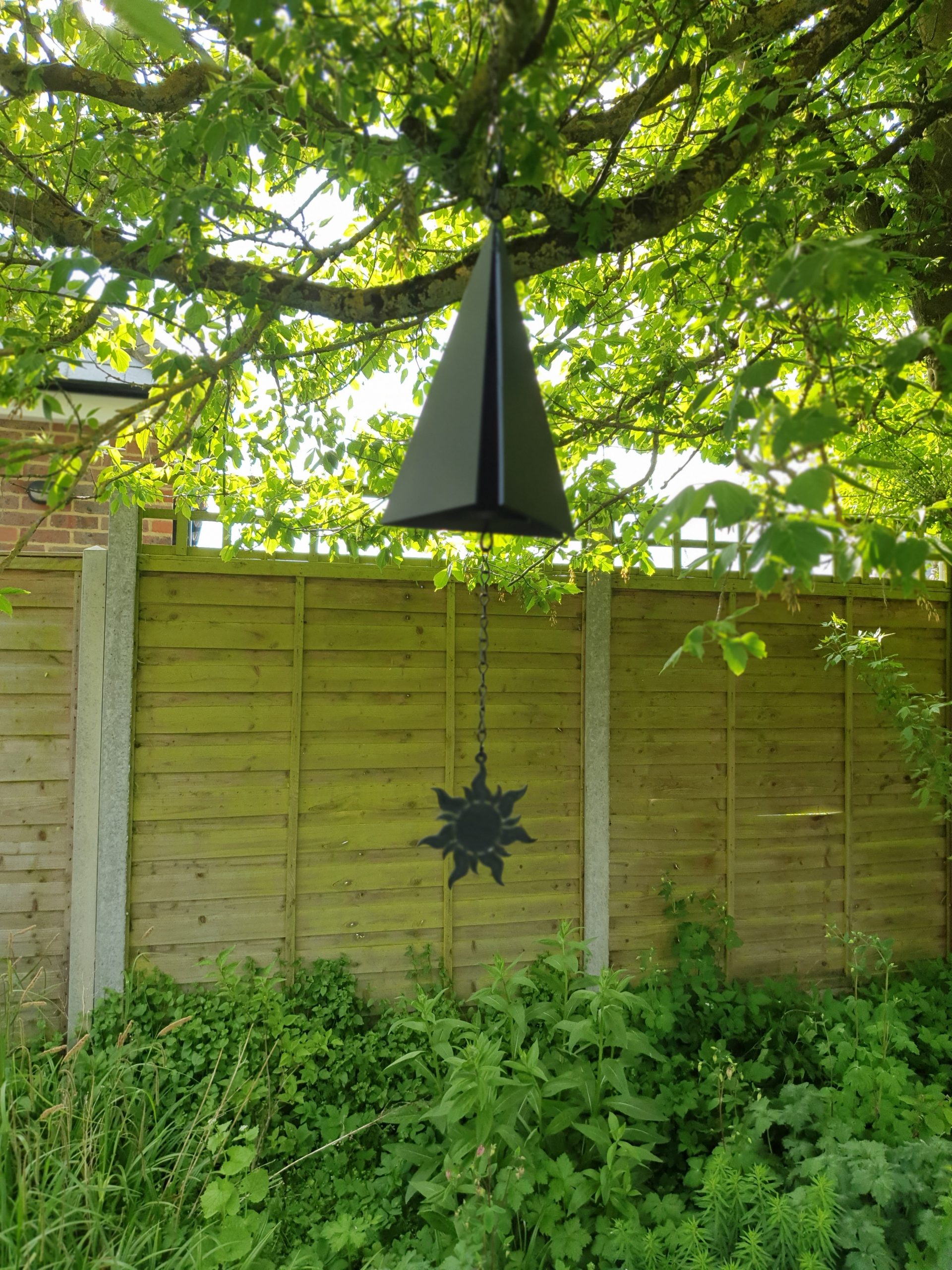 Underneath the wind bell is a pendant wind catcher in the shape of an Sun. This is 3D printed with PLA before being sanded and coated with the same paint as the wind bell.